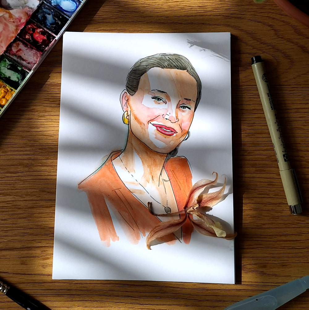 - Retrato en tinta y acuarela sobre papel A5 (21x15 cm).
