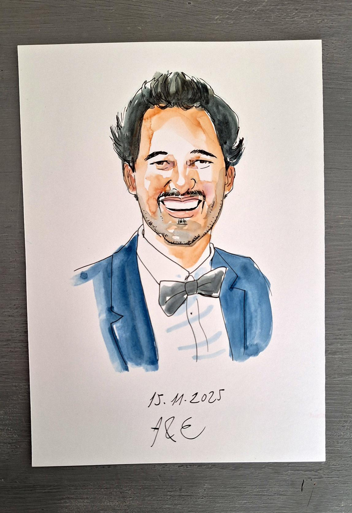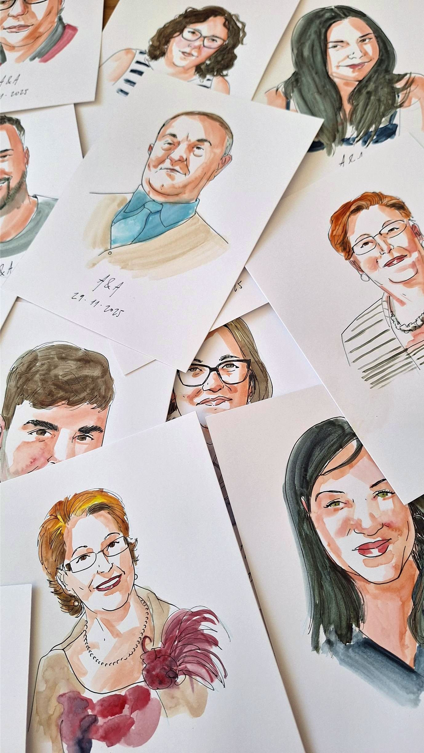 Cada lámina se pinta en tinta y acuarela sobre lámina tamaño A5 (21x15cm.), retrato de busto y fondo blanco. También puedo añadir el nombre de cada persona o un pequeño texto caligrafiado (iniciales, fecha del enlace…).